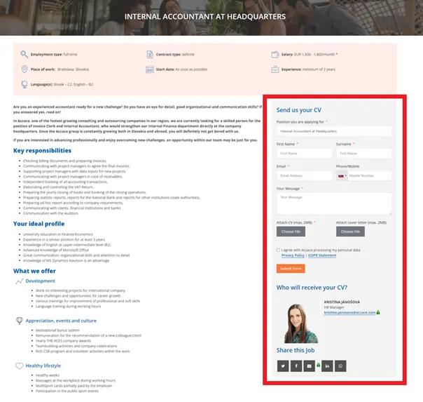The sidebar in job posts is set up as a default feature, based on local needs. It contains the CV submission form (or one of them, if there are multiple) from Accace Forms, which may be different based on job location settings.